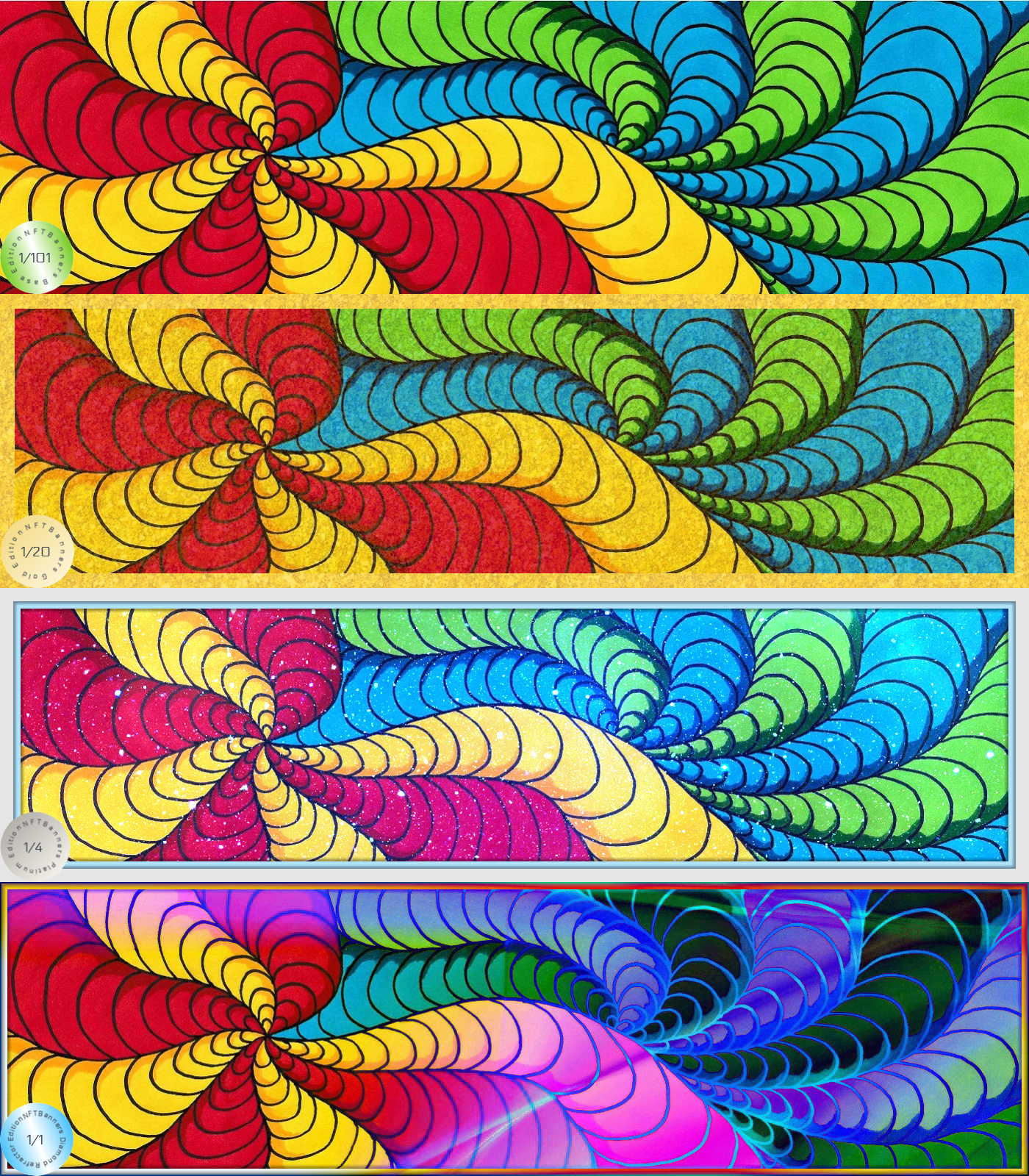 NFTBanners was created to empower artists around the world by delivering custom banner images for Opensea.io and other platforms. Our mission is to supply unique artwork to platform users’ profiles while bringing recognition to known and unknown artists around the world. Artists are privately commissioned and benefit from all their works’ sales. Each custom banner consists of 126 Non-fungible tokens.